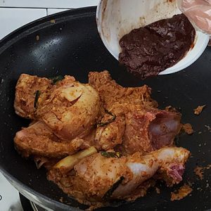 1. Panaskan 2-3 sendok minyak goreng untuk menumis. Tumis bumbu hingga harum. Masukan Bumbu rempah lalu masukan ayam dan aduk hingga merata.