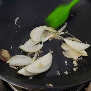 2. Panaskan 2-3 sendok minyak goreng untuk menumis. Tumis bumbu hingga bawang bombay dan bawang putih dan tidak berbau langu.