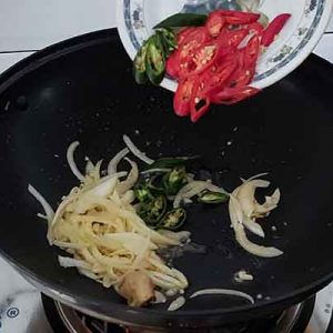 3. Masukan cabai merah dan cabai hijau yang telah dipotong-potong.