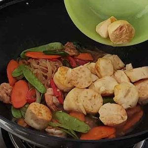 1. Panaskan minyak dan goreng tahu sutera yang sudah dipotong-potong, angkat ketika sudah matang, tiriskan dan taruh diwadah.