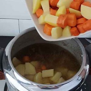 7. Tambahkan wortel dan kentang dan masak hingga wortel dan kentang hampir empuk.